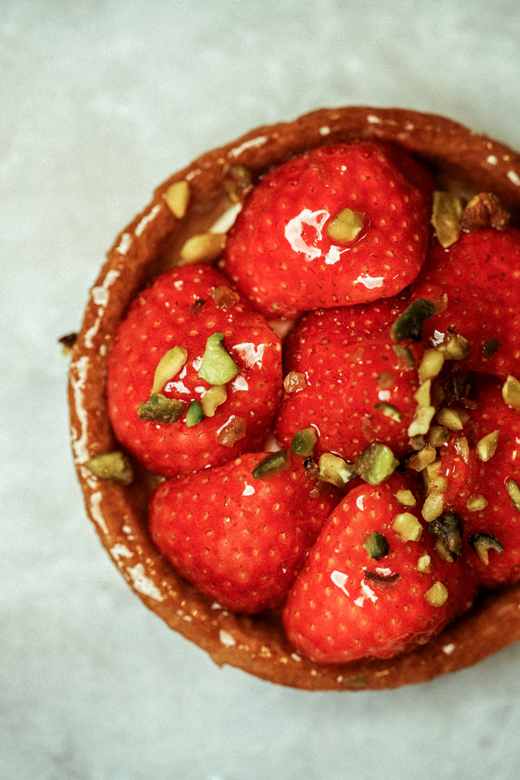 Ingredients: fresh STRAWBERRIES 31%, MILK, sugar, butter, cream, WHEAT flour, EGGS, ALMOND powder, water, EGG yolk, glucose syrup, PISTACHIO, modified starch, gelatine (bovine), rum, salt, stabilisers: E440, E450i, E34, dextrose, acidifier: E330, thickeners: E410, E415, flavouring, colours: beta-carotene, riboflavin.