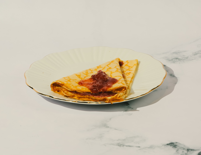 Crêpe moelleuse préparée avec du lait frais entier, de la farine de froment, des œufs et du sucre de canne.